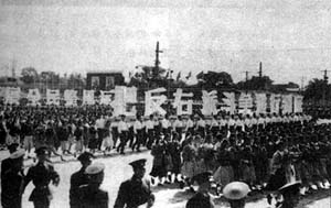 1957年國慶節時,舉著“把反右派鬥爭進行到底”巨幅標語的遊行隊伍。1957年10月15日,中共中央發出《關於劃分右派分子標準的通知》。