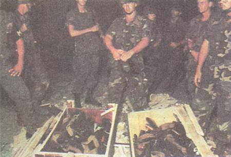 美國海軍陸戰隊員展示出在格林納達小島發現的一個武器儲藏窖