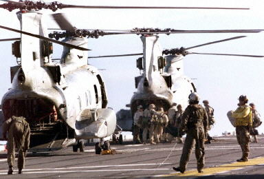 美海軍在海灣登上直升機1998年12月16日,就在離美國會眾院開會表決是否彈劾克林頓不到20小時的時候,白宮突然對伊宣戰。隨著克林頓的一聲令下,部署在海灣地區的美軍戰艦和轟炸機向伊拉克發射了二三百枚聯合國武器核查。美國乃至全世界關注的焦點問題即刻從克林頓彈劾表決轉移到薩達姆的生死存亡。