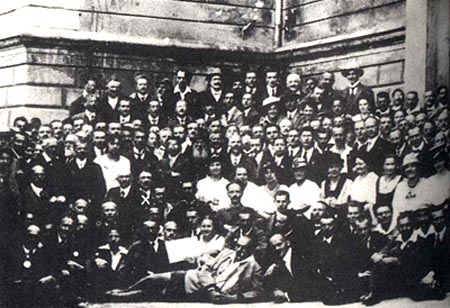 •       1919年1月5日,法西斯黨--德國工人黨(1920年改稱德國國家社會主義工人黨)在慕尼黑成立。希特勒1919年9月加入德國工人黨(後改名為德國國家社會主義工人黨),從事宣傳工作。圖為希特勒以慕尼黑代表的身份,出席國家社會主義者大會(有X記號者為希特勒)。