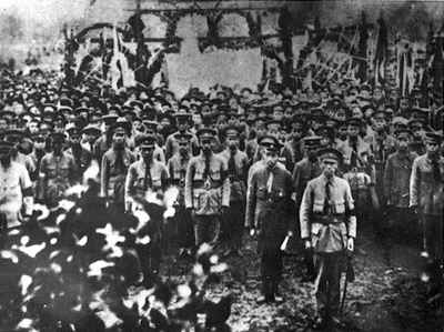 1925年3月25日,東征軍集會追悼孫中山,總指揮蔣介石主持大會,總政治部主任周恩來宣讀祭文